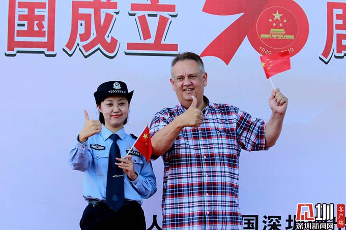 外國(guó)友人與邊檢民警揮舞五星紅旗