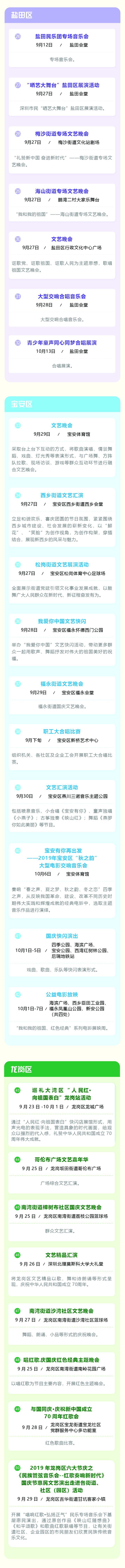 為慶祝中華人民共和國成立70周年,深圳市將舉辦專場音樂會、群眾文藝晚會、焰火晚會等活動,同時(shí)將舉行10場“愛我中華——南粵百園慶國慶”主題游園及80場“我和我的祖國”國慶群眾文藝嘉年華活動。主題游園和文藝嘉年華活動安排如下: