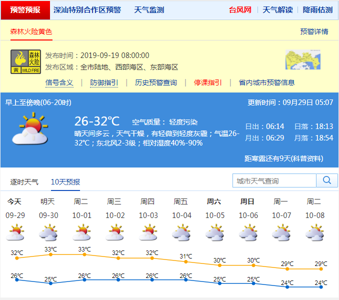 見圳客戶端·深圳新聞網(wǎng)2019年9月29日訊 今天9月29日深圳晴天間多云,天氣干燥,有輕微到輕度灰霾,氣溫26-32℃;東北風(fēng)2-3級(jí);相對(duì)濕度40%-90%。森林火險(xiǎn)預(yù)警生效中,請(qǐng)繼續(xù)做好防火安全宣傳和管理工作。