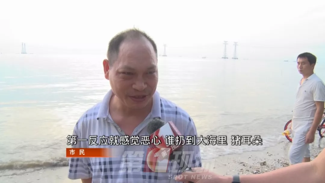 市民郭先生說,前兩天傍晚,他帶孩子到這里時(shí),就已經(jīng)發(fā)現(xiàn)了這一幕??沙^48小時(shí)了,海灘上的豬耳朵仍沒有得到清理。