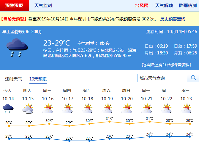 見圳客戶端·深圳新聞網(wǎng)2019年10月14日訊 受冷空氣影響,昨日凌晨至上午深圳普降大雨,局部暴雨,并伴有雷暴和7級(jí)左右短時(shí)大風(fēng)。預(yù)計(jì)本周前期風(fēng)力清勁有陣雨,中后期晴好干燥。其中,周一有陣雨,高地、沿海和海區(qū)陣風(fēng)6-7級(jí),早晚較涼,氣溫23-29℃;周二漸轉(zhuǎn)多云,陣風(fēng)7-8級(jí);周三至周日晴天干燥。
