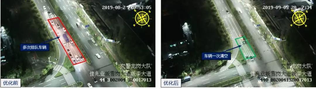 針對(duì)這一問(wèn)題,深圳交警根據(jù)路口各時(shí)段、各方向的通勤需求,調(diào)整優(yōu)化了路口紅綠燈配時(shí)方案,適當(dāng)增加了擁堵方向時(shí)間。優(yōu)化后,路口晚高峰西往東方向車輛排隊(duì)由300多米降至60米左右,下降80%,車輛基本實(shí)現(xiàn)1次通行。
