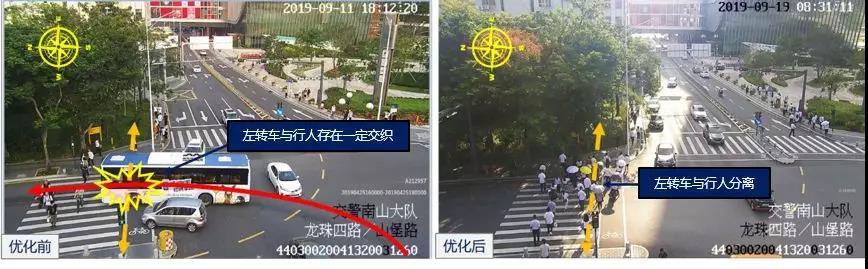 對(duì)此,深圳交警于9月11日對(duì)該路口進(jìn)行再優(yōu)化,調(diào)整東西向機(jī)動(dòng)車放行方案,分離北面行人與西面左轉(zhuǎn)車,從而保障北面行人過(guò)街安全。優(yōu)化后,該路口東西行行人與同向左轉(zhuǎn)車分離,行人過(guò)街安全更有保障。