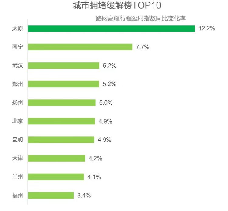 從本季城市擁堵緩解榜來看,太原路網(wǎng)高峰行程延時指數(shù)同比下降最大,達(dá)12.2%,其次是南寧和武漢。擁堵緩解的10個城市中有9個為直轄市或省會城市。