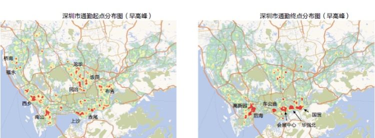 基于高德交通大數(shù)據(jù),《報告》還挖掘分析了深圳潮汐通勤起終點(diǎn)分布情況。以2019Q3期間深圳市早高峰通勤為例,從深圳市總體來看,早高峰通勤起點(diǎn)相對分散;而通勤終點(diǎn)相對集中,主要集中在深圳市南部的幾個片區(qū)。早高峰通勤起點(diǎn)分布相對密集區(qū)域,如西鄉(xiāng)、南山、上沙等地;通勤終點(diǎn)則主要集中在高新園、后海等地。