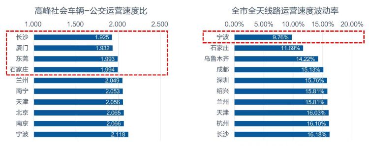 從細分指標看,《報告》將公交運營速度與同時段、同線路的社會車輛速度進行對比,能夠較直接、客觀地反映公交運行效率與城市交通效率的相對水平,值越小表示兩者速度差距也越小。三季度,長沙城市核心區(qū)內(nèi)的高峰期“社會車輛-公交車速度比”最小,小汽車速度是公交的1.925倍。本季長沙、廈門、東莞、石家莊4個城市在高峰期“社會車輛與公交車速比”系數(shù)均低于2.0。