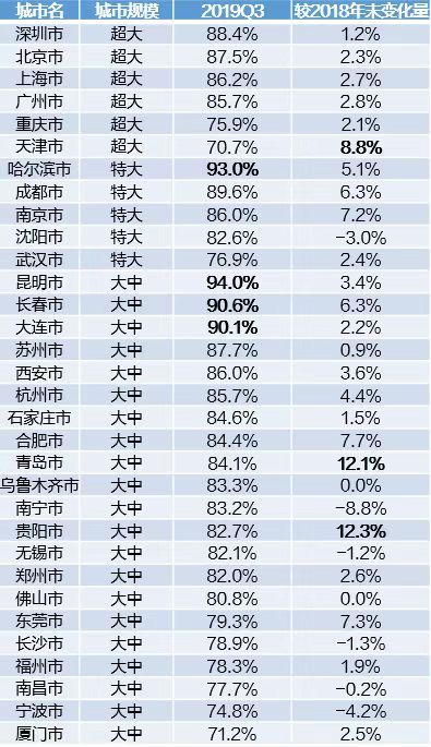 三季度相比2018年末,國內(nèi)絕大多數(shù)城市軌道交通站點銜接率均有提升。哈爾濱、昆明、長春和大連4個城市的銜接率超過90%,較2018年末又增加了2個城市;貴陽、青島和天津的軌道交通站點銜接率提升最大,說明這些城市的公交站點與地鐵站出入口的連接情況得到明顯改善。