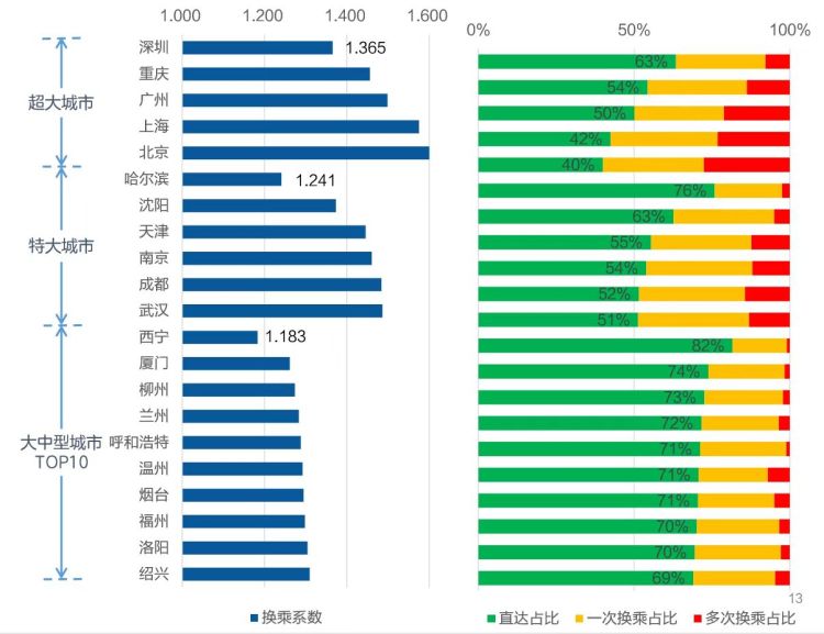 從搭乘公交的便捷度看,超大城市的換成系數(shù)普遍高于特大城市,而特大城市又普遍高于大中城市。在超大城市中,深圳公交的換乘系數(shù)最小;哈爾濱、西寧公交的換乘系數(shù)分別在特大和大中型城市中最小。