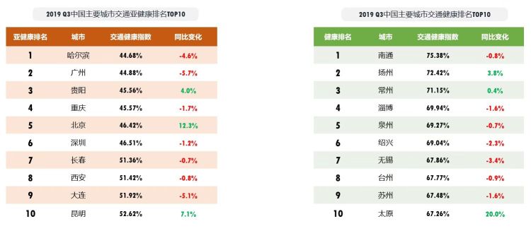 同比2018Q3,交通亞健康榜TOP10中北京交通健康狀態(tài)明顯變好,其交通健康指數(shù)同比上升12.3%;其次昆明、貴陽交通健康指數(shù)同比分別上升7.1%、4.0%。交通健康榜TOP10中首次入榜的省會(huì)城市太原,其交通健康指數(shù)同比上升幅度達(dá)20%,或主要與“第二屆全國青年運(yùn)動(dòng)會(huì)”期間單雙號限行有關(guān)。