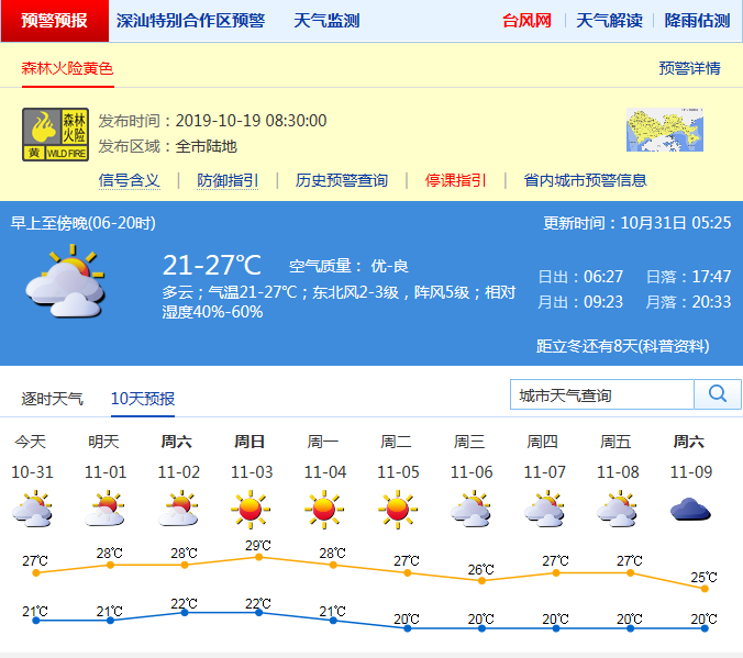 市氣象局預(yù)計(jì)31日多云,氣溫21-27℃,東北風(fēng)2-3級(jí),陣風(fēng)6級(jí);相對(duì)濕度40%-75%。未來(lái)一周天氣持續(xù)干燥,晝夜溫差加大,早晚清涼。森林火險(xiǎn)黃色預(yù)警信號(hào)持續(xù)生效中。