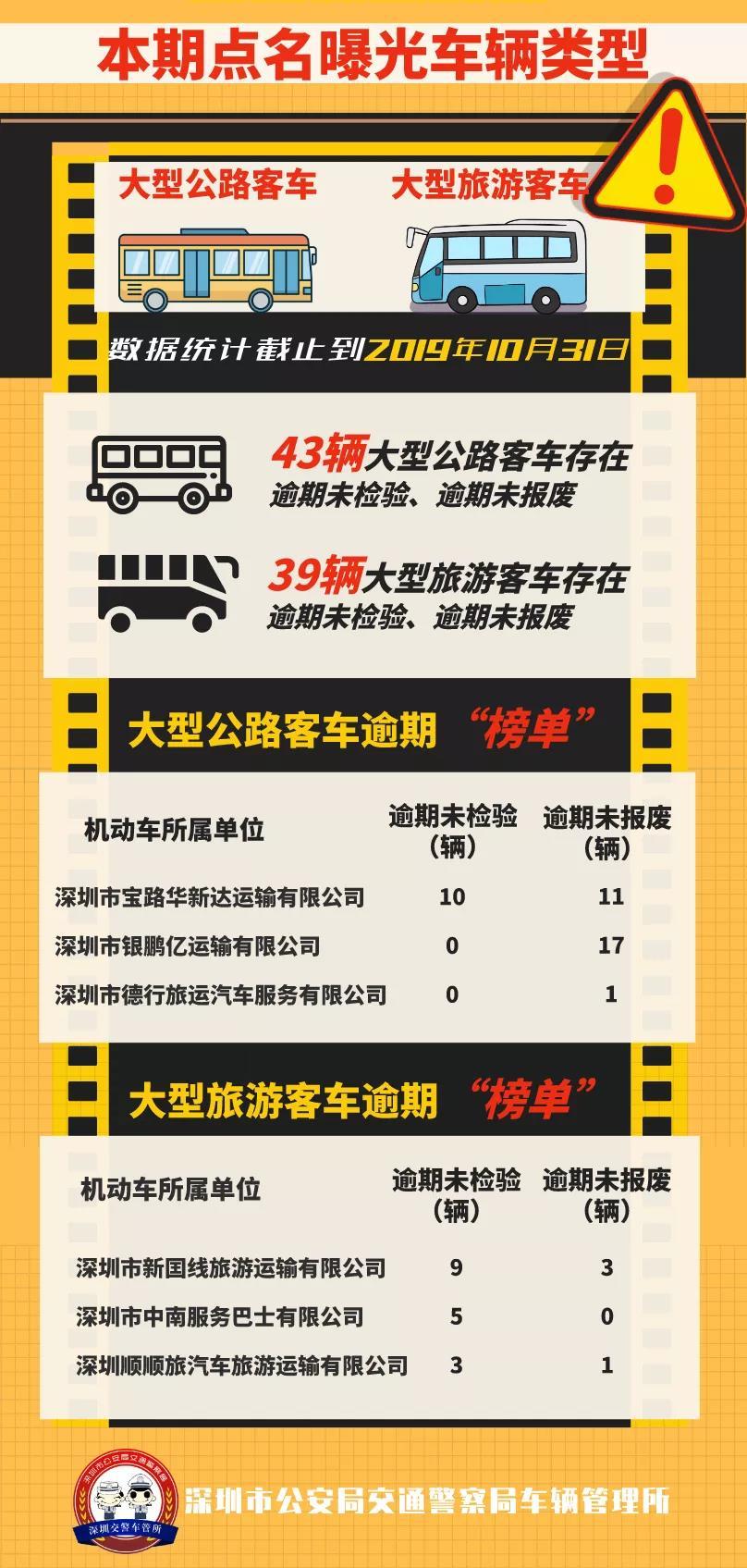見圳客戶端·深圳新聞網(wǎng)2019年11月01日訊 部分企業(yè)、駕駛?cè)撕鲆暟踩珕栴},對名下“逾期客車”遲遲不處理,存在著重大安全隱患。10月31日,深圳車管所微信公號消息對重點隱患車輛點名曝光。