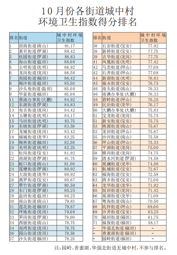 10月份各區(qū)城中村環(huán)境衛(wèi)生指數(shù)得分排名