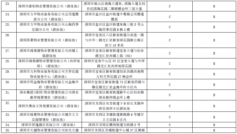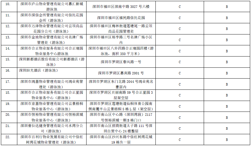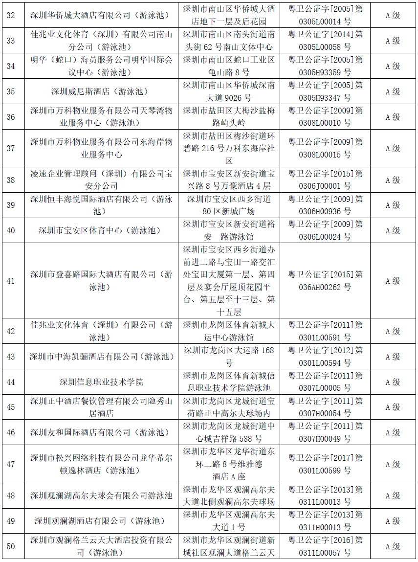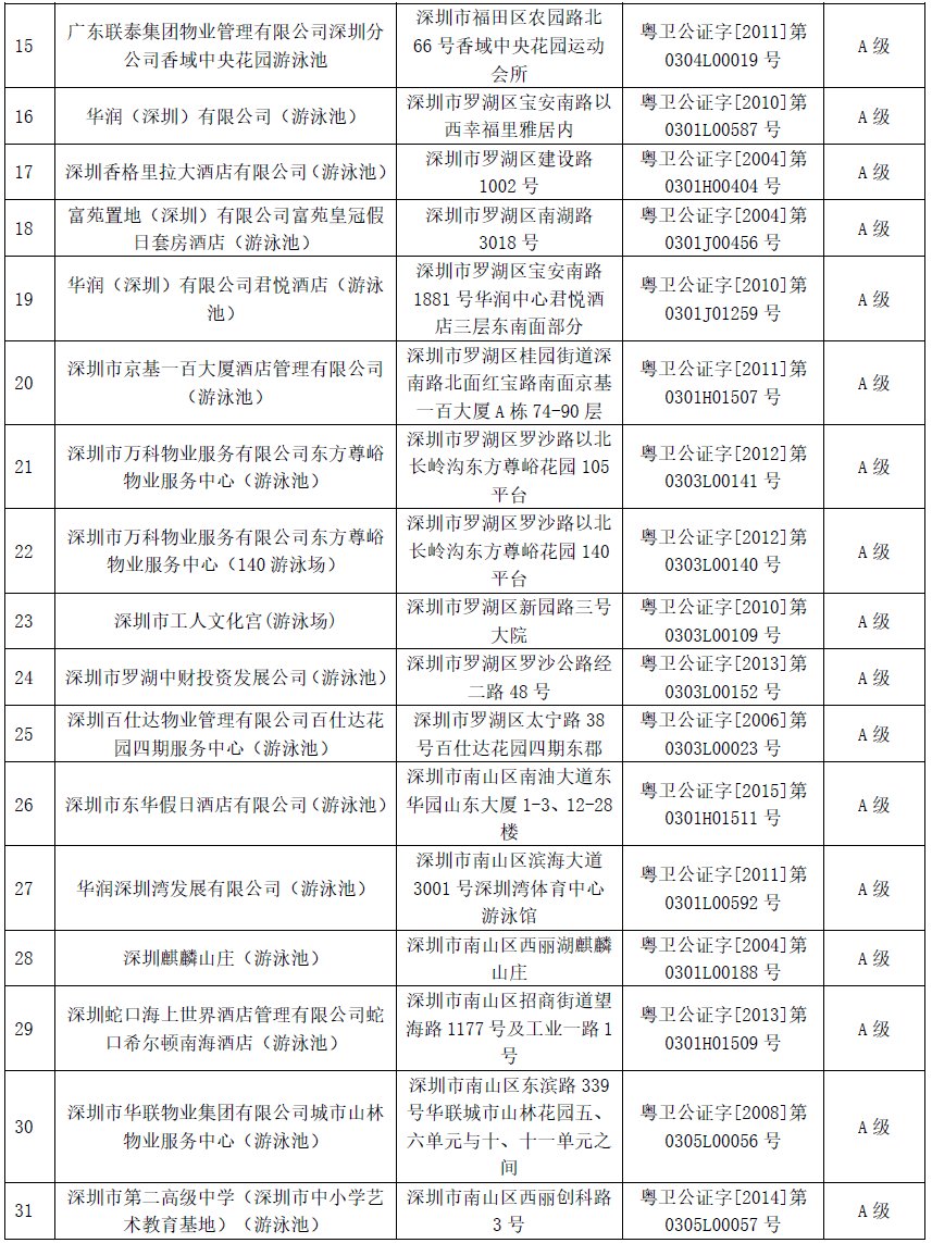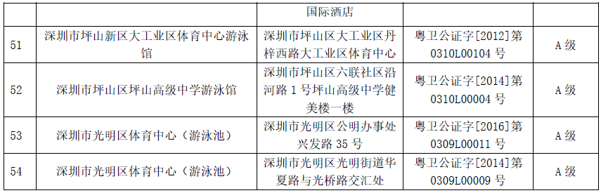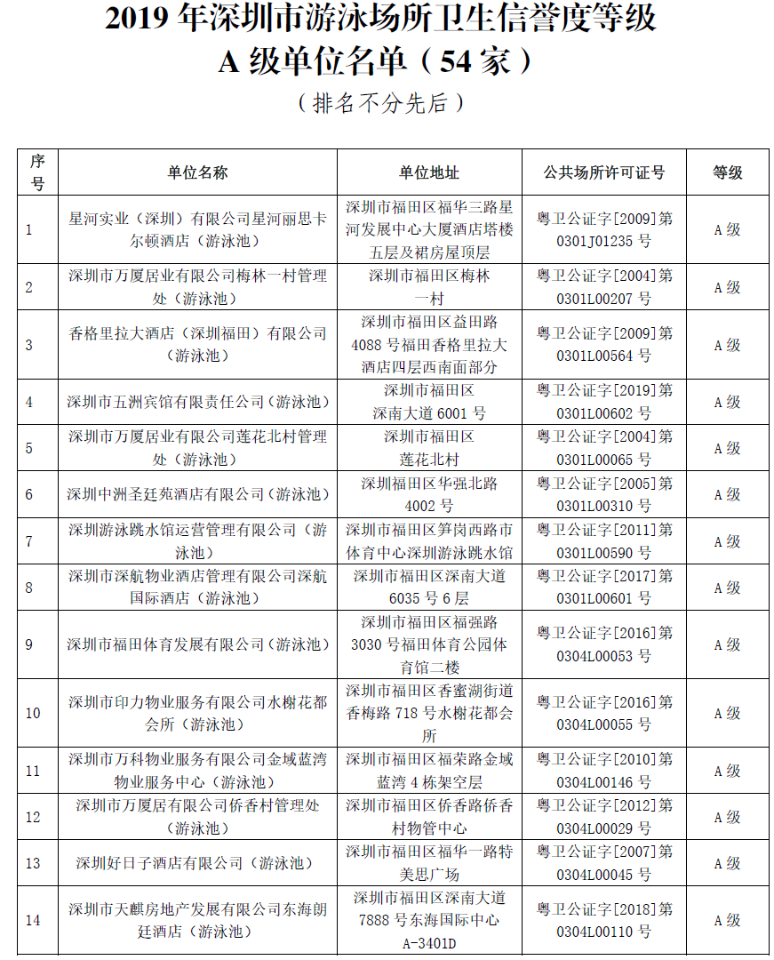 附:2019年深圳市游泳場所衛(wèi)生信譽度等級A級名單