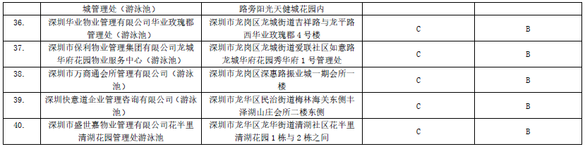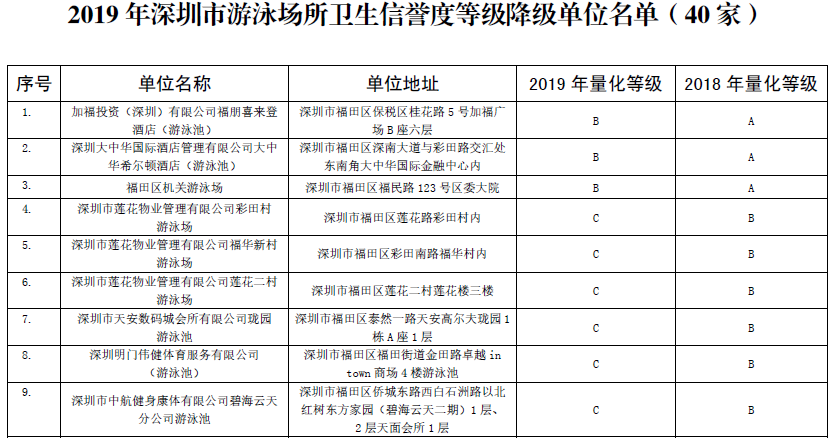 2019年深圳市游泳場所衛(wèi)生信譽度等級降級單位名單