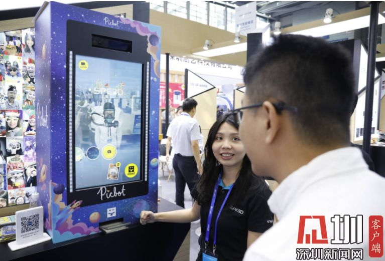 2019年11月13日,深圳會(huì)展中心,一位正在與機(jī)器互動(dòng)的觀眾。該機(jī)器是由臺(tái)灣公司啟云科技設(shè)計(jì),多用在營(yíng)銷領(lǐng)域,用戶可與之互動(dòng)拍出照片。
