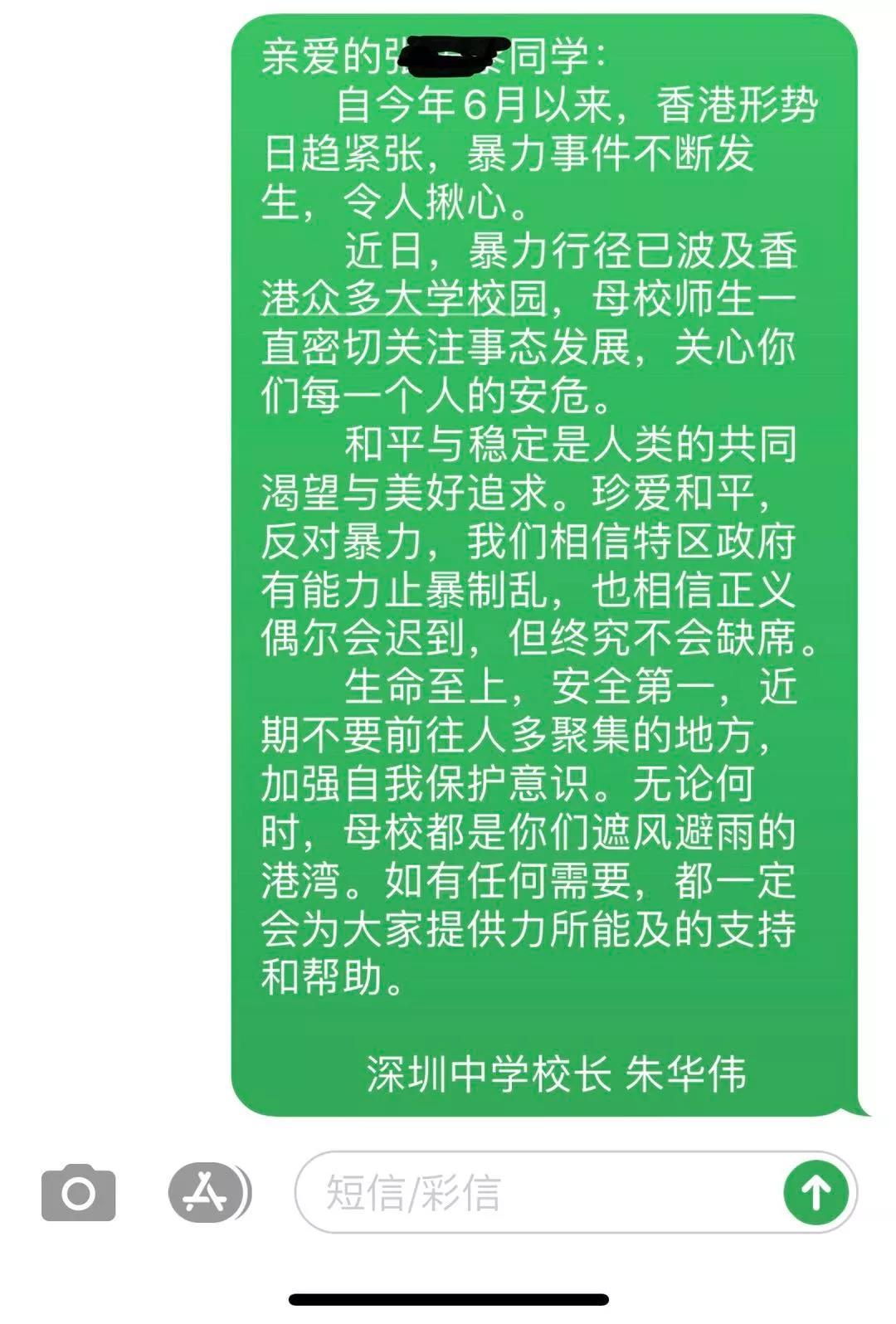 此外,深圳中學校長朱華偉還向在港的深中學子發(fā)送了問候短信,希望他們多注意自身安全,“無論如何,母校都是你們遮風避雨的港灣”,讓收到短信的學子倍感溫暖。