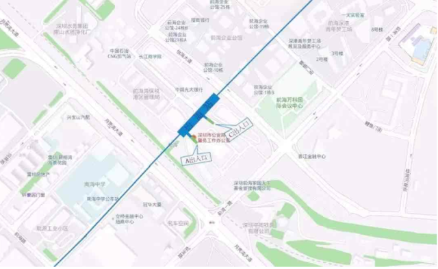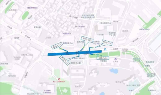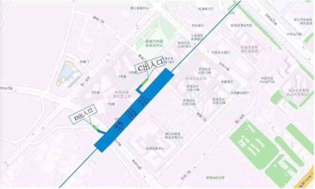 怡海站位于怡海大道與月亮灣大道中間,車站出入口共計(jì)4個(gè),B、D出入口預(yù)留,A出入口接光大銀行,連接怡海大道,C出入口前海展廳旁,連接A號公路