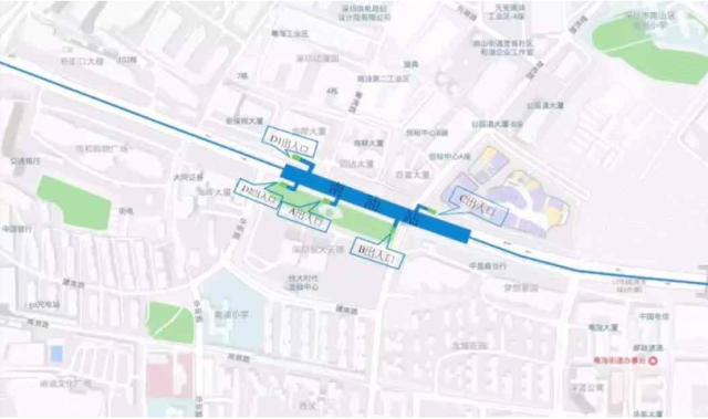南油站位于南山區(qū)南海大道與登良路交叉口下方,車站出入口共計(jì)5個(gè),B出入口位于恒大天璟北側(cè),C出入口位于來福士廣場一側(cè)登良路與南海大道交匯處,D1出入口位于金暉大廈東側(cè),A、D2出入口位于南海大道與華明路交匯處
