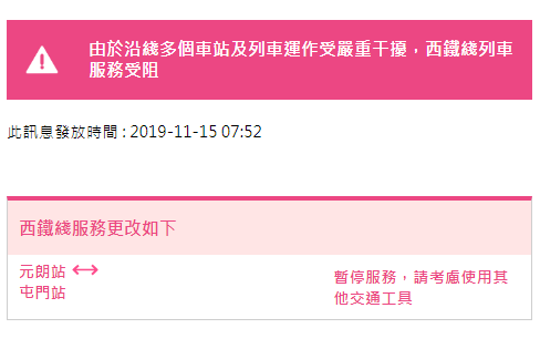 07:52,西鐵線服務(wù)更改為:元朗站往返屯門站暫停服務(wù)。