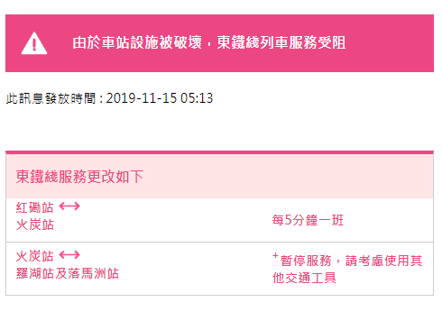 港鐵于今早05:05發(fā)布通告稱,港鐵各線列車服務(wù)延誤或受阻,經(jīng)詳細(xì)風(fēng)險(xiǎn)評(píng)估及相關(guān)政府部門商討后,港鐵各線(機(jī)場(chǎng)快線除外)、輕鐵及港鐵巴士的服務(wù)將于晚上10時(shí)結(jié)束。由頭班車起,東鐵線大學(xué)至羅湖及落馬洲站暫時(shí)關(guān)閉,列車也不停相關(guān)車站。