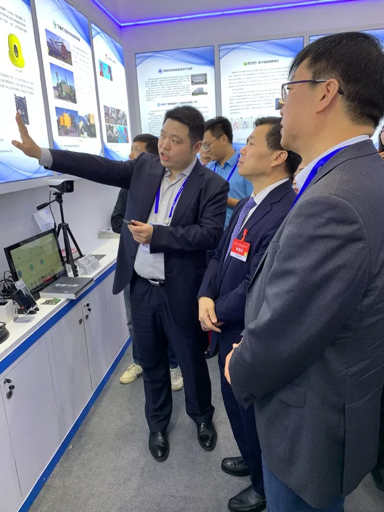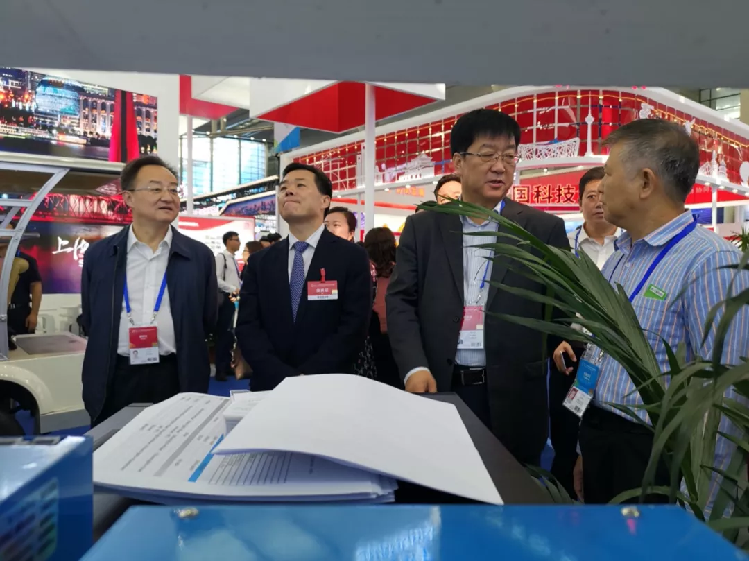 新疆維吾爾自治區(qū)政府副秘書長(zhǎng)許龍章、科技廳廳長(zhǎng)張小雷、科技廳副廳長(zhǎng)劉智敏參觀新譯展區(qū)
