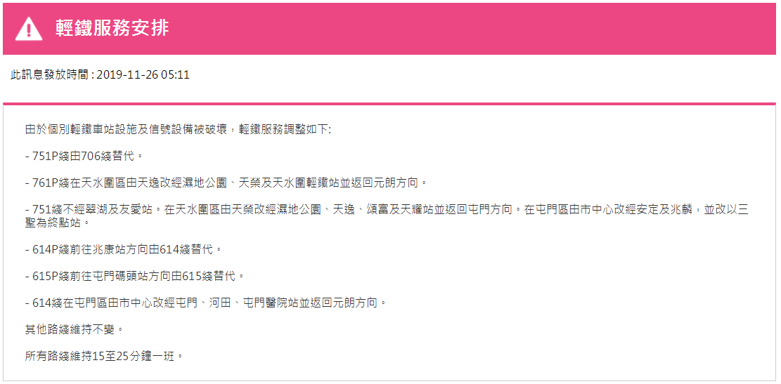 據(jù)港鐵消息,11月26日,香港地鐵各線(機場快線除外)、輕鐵及港鐵巴士的服務(wù)將于晚上11:30時結(jié)束。大學(xué)站繼續(xù)關(guān)閉,列車不停大學(xué)站。個別車站出入口也會暫時關(guān)閉。