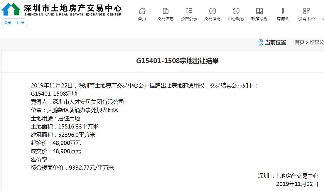見圳客戶端·深圳新聞網2019年11月27日訊 記者從深圳政府在線網站了解到,11月22日下午,深圳市首宗出售型人才住房用地--G15401-1508宗地即大鵬新區(qū)壩光03-08地塊,被深圳市人才安居集團以總價4.89億元成功競得。