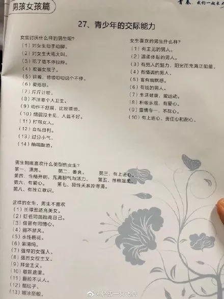 中國新聞網(wǎng)2019年12月6日訊 有網(wǎng)友舉報稱,深圳市龍華區(qū)發(fā)放的《中小學(xué)青春期心理生理衛(wèi)生常識手冊》中存在性別歧視等問題,有“這樣的女生,男生不喜歡”,“女生喜歡的男生什么樣?(6):有錢”,“男生不喜歡的女生什么樣?(9):拜金”等種種不當(dāng)表述。12月5日,深圳市龍華區(qū)教育局回應(yīng)稱,已立即停止該項目,同時安排收回所有已下發(fā)的資料冊。