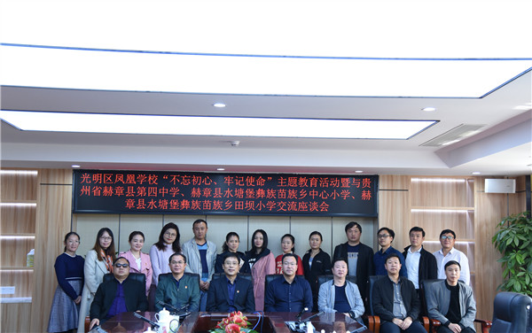 研討課后,光明區(qū)委教育工委副書記嚴(yán)亮,鳳凰學(xué)校校長華建明,校長助理王珍、何運敏等與赫章縣教育同仁共同參加了 “不忘初心、牢記使命”主題教育交流座談會。