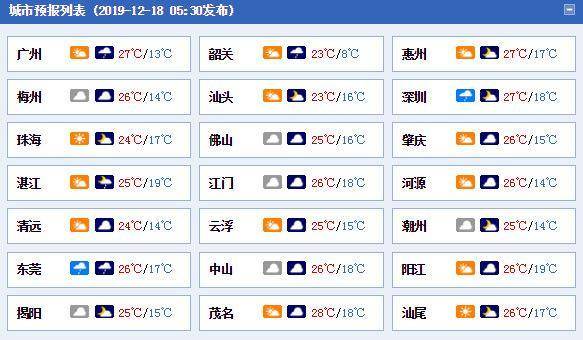 18日起三天,中等強度冷空氣逐漸自北向南影響廣東,天氣轉為陰冷,北部市縣有小雨局部中雨(日平均氣溫下降6~8℃),中部市縣有小雨(日平均氣溫下降4~6℃),南部市縣有分散小雨(日平均氣溫下降3~5℃),陸地風力逐漸轉為偏北風3-4級陣風5級,高海拔或高地風力可達4-5級陣風6級。