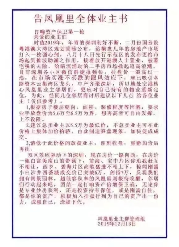 近日,福海街道中糧鳳凰里花苑小區(qū)個別業(yè)主發(fā)布集體漲價言論,涉嫌惡意炒作二手房價,以下為網(wǎng)傳業(yè)主倡議書