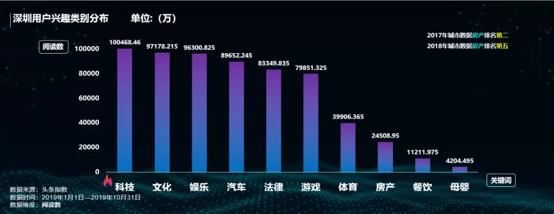 今年深圳網(wǎng)友對(duì)科技最感興趣,文化次之。房產(chǎn)排名連續(xù)兩年下滑,2017年排名第二,2018年跌至第五,而今年降至第八。