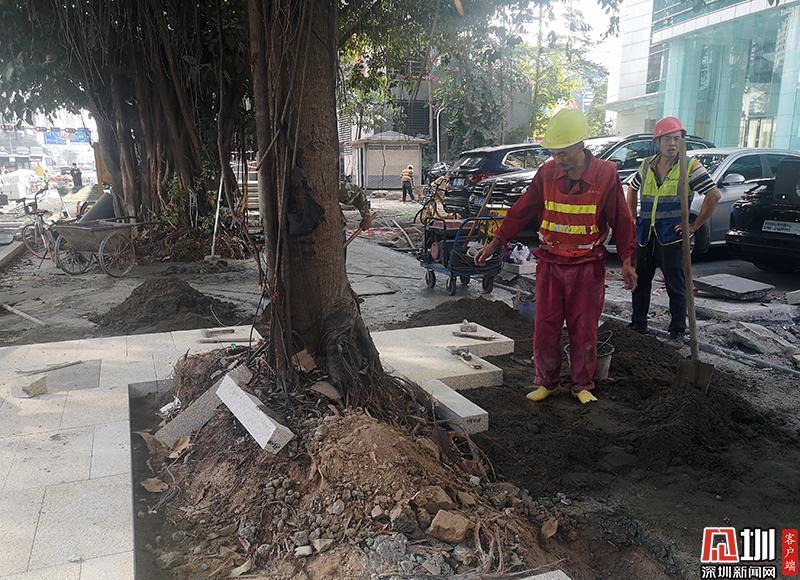 上午10點,深圳市交通運輸局執(zhí)法人員來到福田區(qū)民田路與福華路路口的一處施工現(xiàn)場。記者在現(xiàn)場看到,沿著福華路一側(cè)的人行道基本全部被挖開,建筑工人正在進行人行道石磚的鋪設(shè)工作,由于施工圍擋布置不規(guī)范,現(xiàn)場也沒有完善的路線指引,不少市民出行受阻。