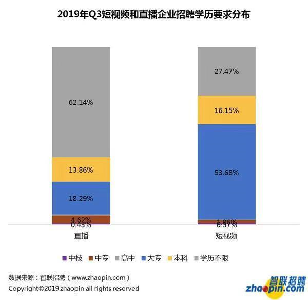 短視頻相關(guān)崗位對內(nèi)容創(chuàng)意、視頻編輯等知識和技能的要求更高,因此對人才素質(zhì)要求也更高。2019年三季度,短視頻招聘職位中,53.68%的職位要求大專學(xué)歷,16.15%的職位要求本科學(xué)歷,直播領(lǐng)域的這兩個(gè)比例分別為18.29%和13.86%,卻有62.14%的崗位不限學(xué)歷。