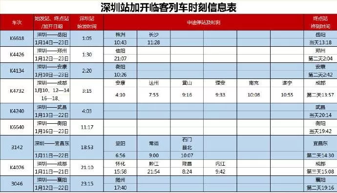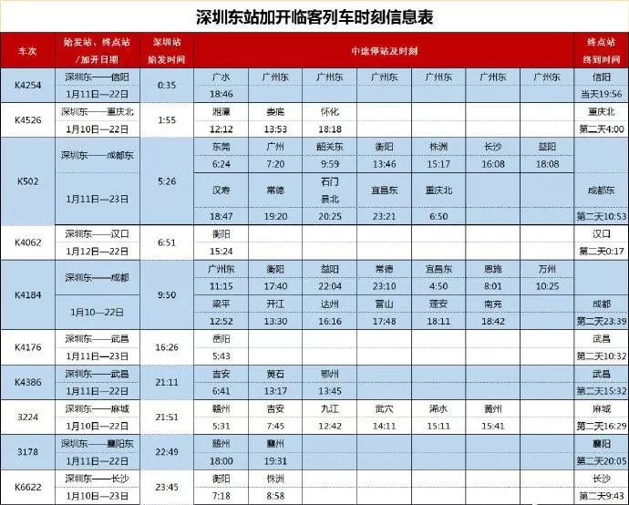 春節(jié)前,深圳站和深圳東站單天將最多加開19趟臨時長途旅客列車,其中深圳站始發(fā)9趟,深圳東站始發(fā)10趟。