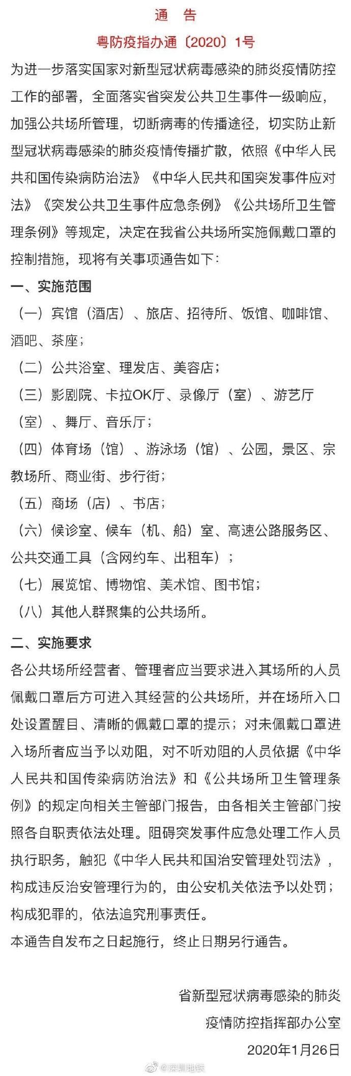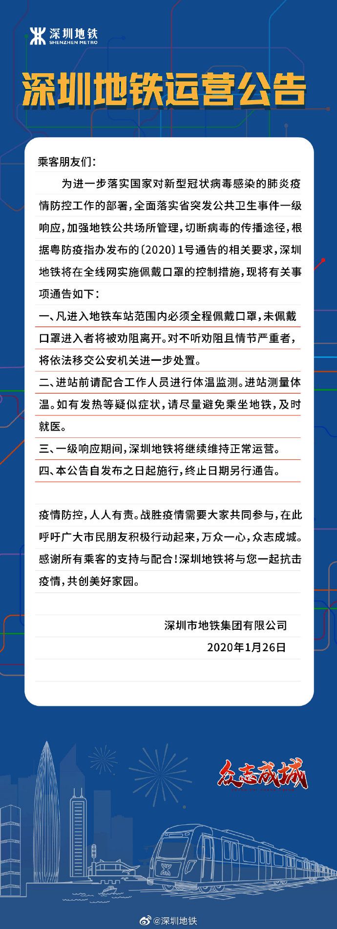 見圳客戶端·深圳新聞網(wǎng)2020年1月27日訊 深圳地鐵官方微博1月26日發(fā)布運(yùn)營公告:根據(jù)粵防疫指辦發(fā)布的〔2020〕1號(hào)通告的相關(guān)要求,為全面落實(shí)省突發(fā)公共衛(wèi)生事件一級(jí)響應(yīng),加強(qiáng)地鐵公共場所管理,切斷病毒的傳播途徑,即日起,凡進(jìn)入地鐵車范圍內(nèi)必須全程佩戴口罩,未佩戴口罩進(jìn)入者將被勸阻離開。對(duì)不聽勸阻且情節(jié)嚴(yán)重者,將依法移交公安機(jī)關(guān)進(jìn)一步處置。