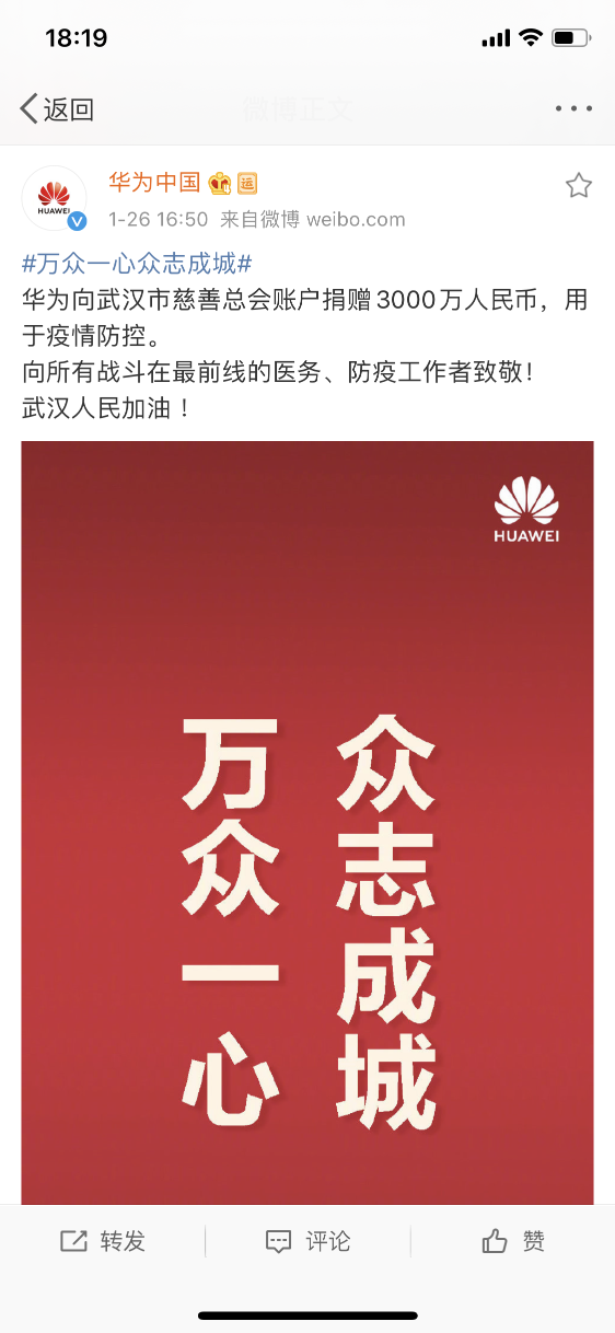 華為表示:“向所有戰(zhàn)斗在最前線的醫(yī)務、防疫工作者致敬!武漢人民加油!”