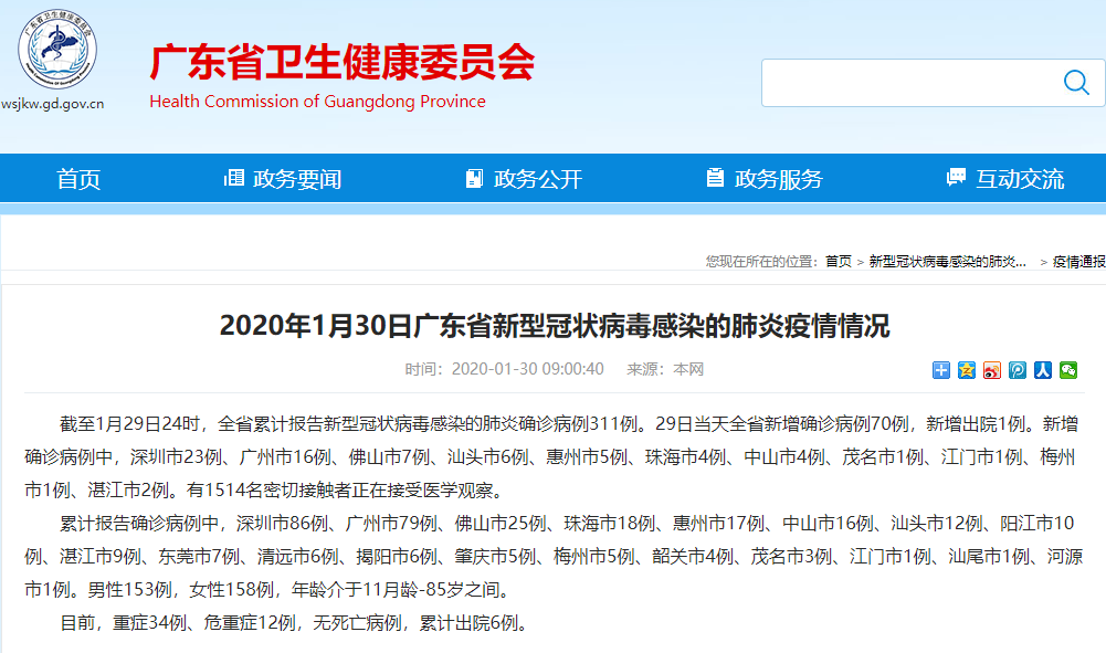 截至1月29日24時(shí),廣東省累計(jì)報(bào)告新型冠狀病毒感染的肺炎確診病例311例。29日當(dāng)天廣東全省新增確診病例70例,新增出院1例。新增確診病例中,深圳市23例、廣州市16例、佛山市7例、汕頭市6例、惠州市5例、珠海市4例、中山市4例、茂名市1例、江門(mén)市1例、梅州市1例、湛江市2例。有1514名密切接觸者正在接受醫(yī)學(xué)觀察。