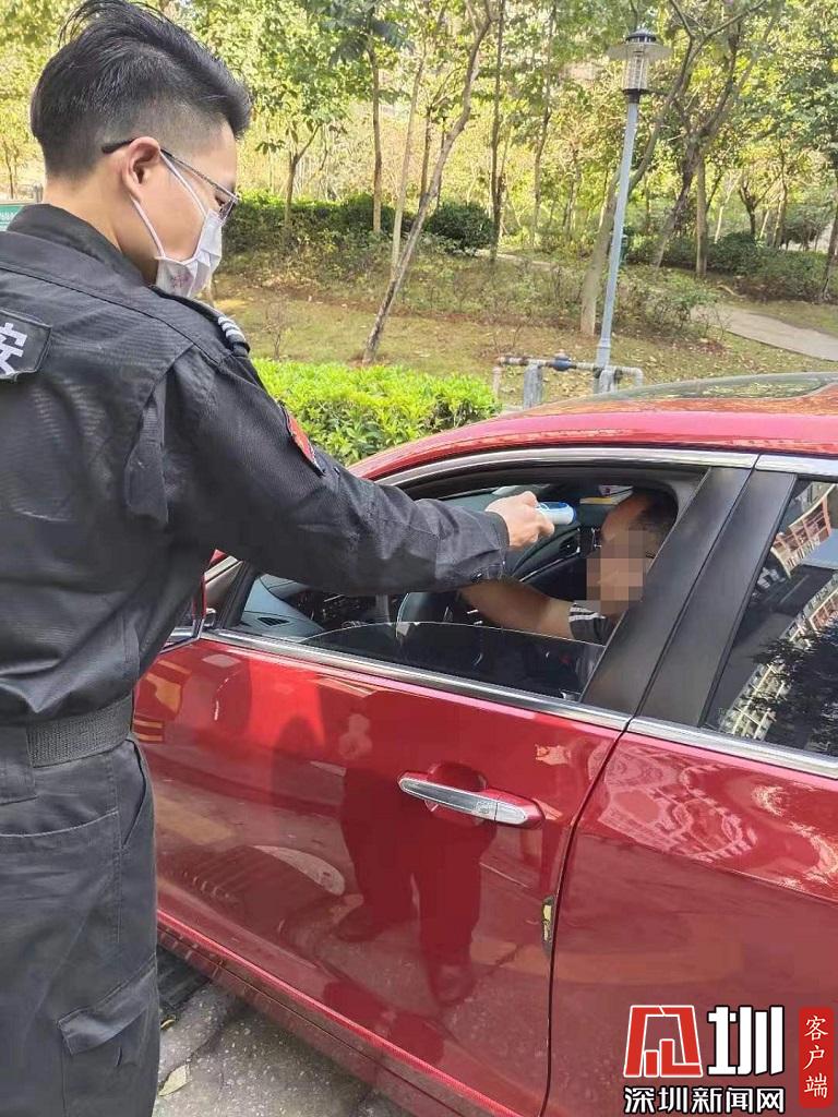 保安對(duì)進(jìn)出小區(qū)車(chē)主進(jìn)行體溫測(cè)量。