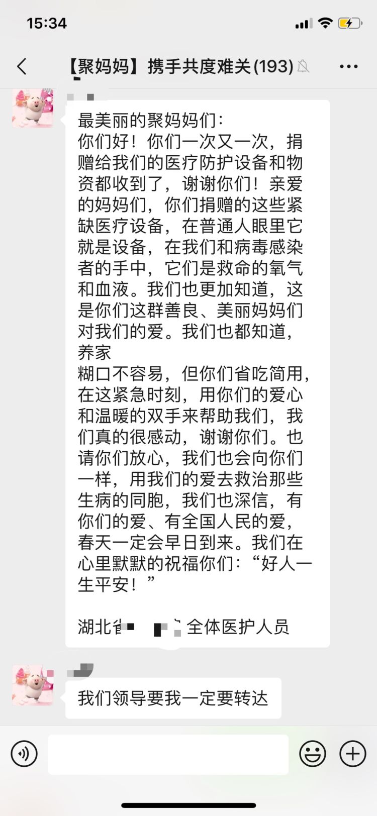 “最美麗的聚媽媽們,你們捐贈的這些緊缺醫(yī)療設(shè)備,在普通人眼里它就是設(shè)備,在我們和病毒感染者的手中,它們是救命的氧氣和血液”,武漢一家醫(yī)院的醫(yī)護(hù)人員在近日發(fā)來的感謝信中說,“請你們放心,我們也會向你們一樣,用我們的愛去救治那些生病的同胞,我們也深信,有你們的愛、有全國人民的愛,春天一定會早日到來。”(記者陳姝)