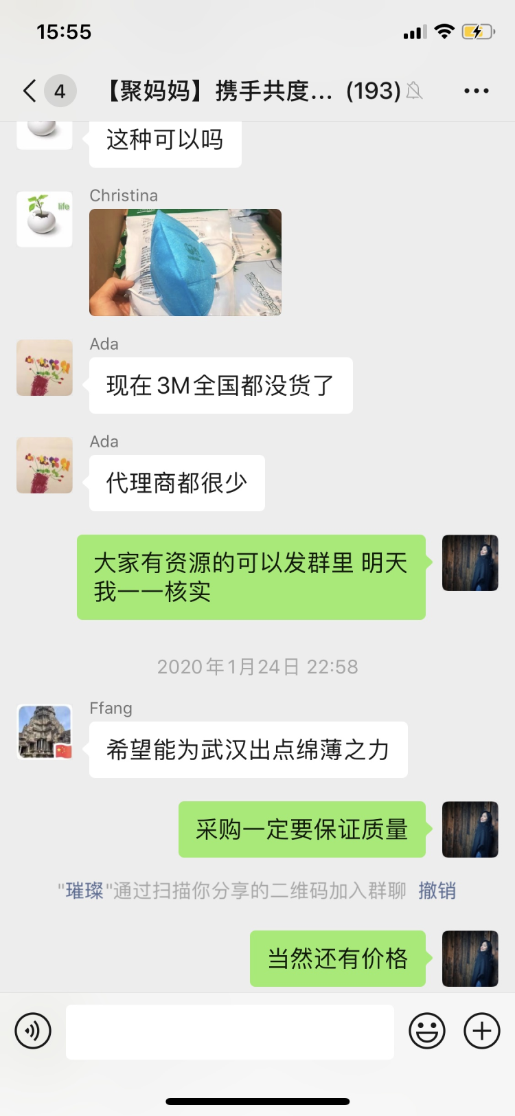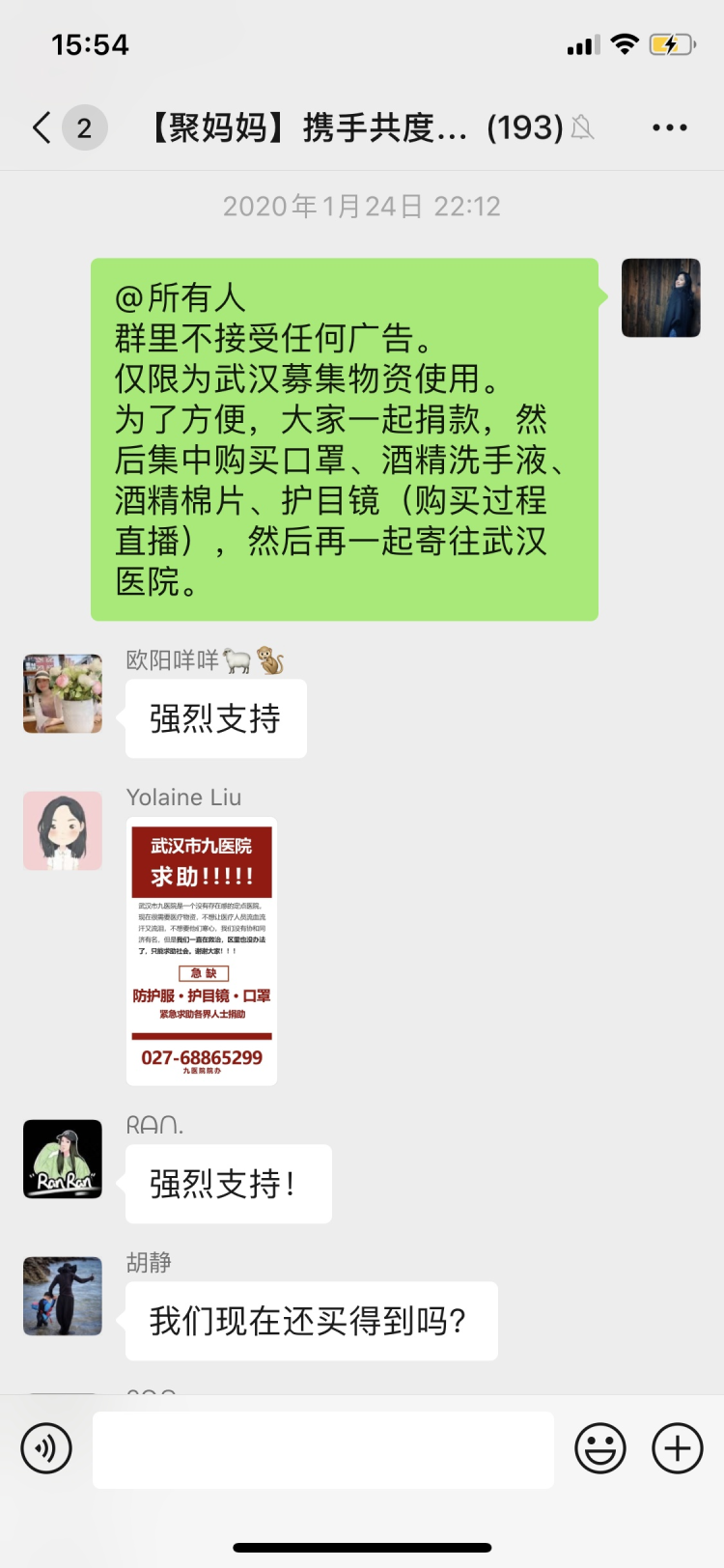 這一百多名媽媽是一個名為“聚媽媽攜手共渡難關(guān)”(以下簡稱“聚媽媽”)微信群的成員,Miya是“聚媽媽”的發(fā)起人之一。1月24日除夕那天,Miya與一位朋友聊起疫情,兩人都覺得,醫(yī)院缺物資,一兩人的力量又太單薄,不如發(fā)動朋友們一起購買直接送到醫(yī)院。Miya在當(dāng)晚9點左右建了這個臨時群,并邀請周圍熟識的朋友加入。