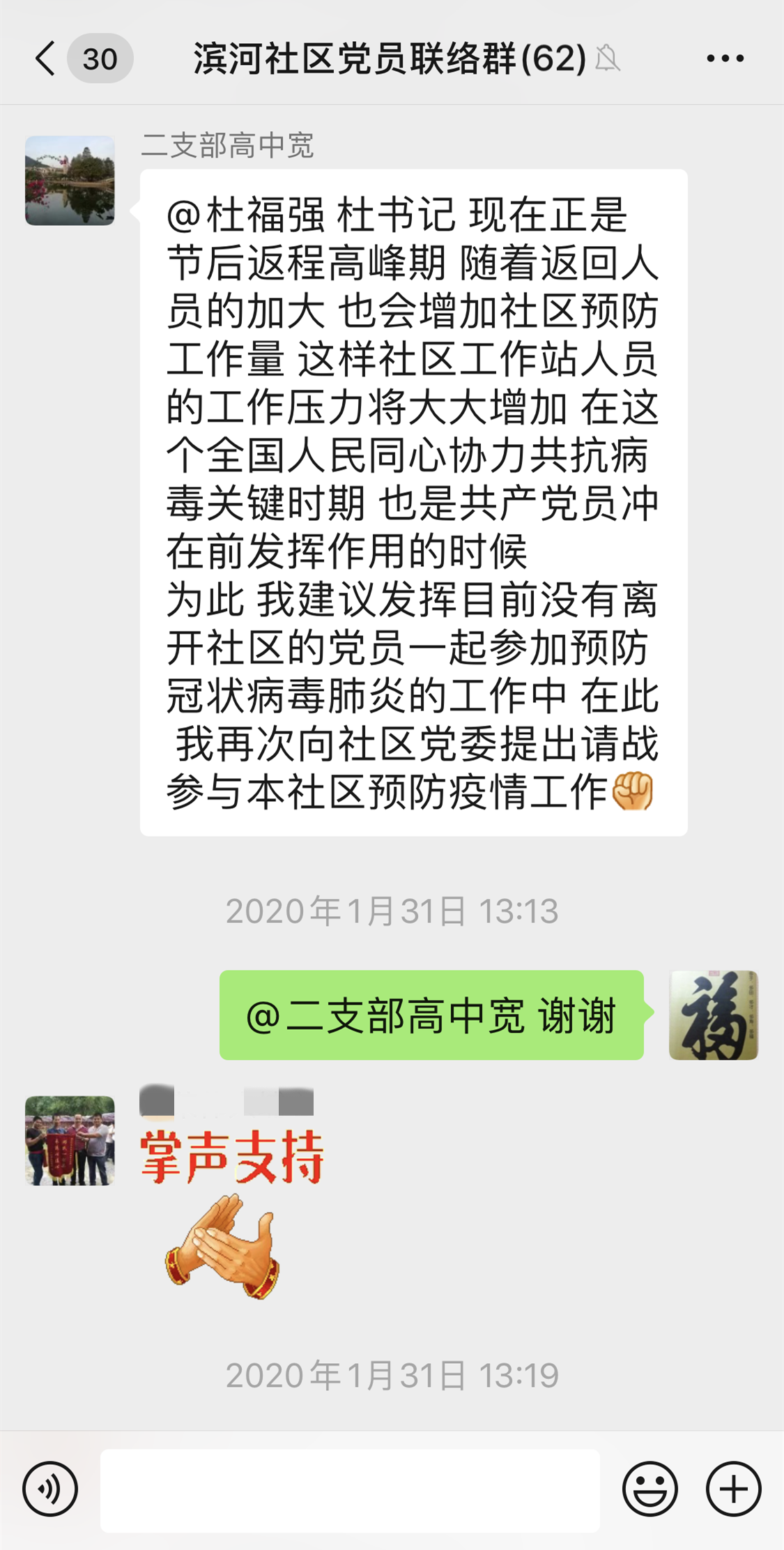 深圳新聞網(wǎng)2月2日訊(見(jiàn)圳客戶(hù)端、深圳新聞網(wǎng)記者 邱曉潔)“在此,我再次向社區(qū)黨委提出請(qǐng)戰(zhàn)參與本社區(qū)預(yù)防疫情工作。”1月31日,福田區(qū)南園街道濱河社區(qū)老黨員高中寬在濱河社區(qū)黨員聯(lián)絡(luò)微信群里再次主動(dòng)請(qǐng)纓參與社區(qū)疫情防控工作。