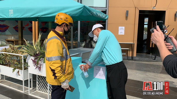 姚酸菜魚正在對前來取餐的外賣小哥進行消毒。