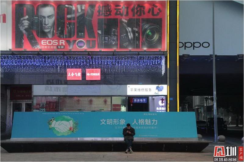 一名市民坐在在華強北電子市場街邊“孤獨”地玩手機