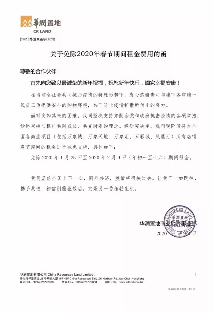 華潤置地宣布免收1月25日—2月9日全國所有商業(yè)項(xiàng)目的租金,與商戶攜手共進(jìn)。