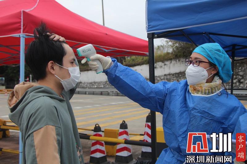 醫(yī)護(hù)人員正給一名體溫異常的乘客測(cè)量體溫。