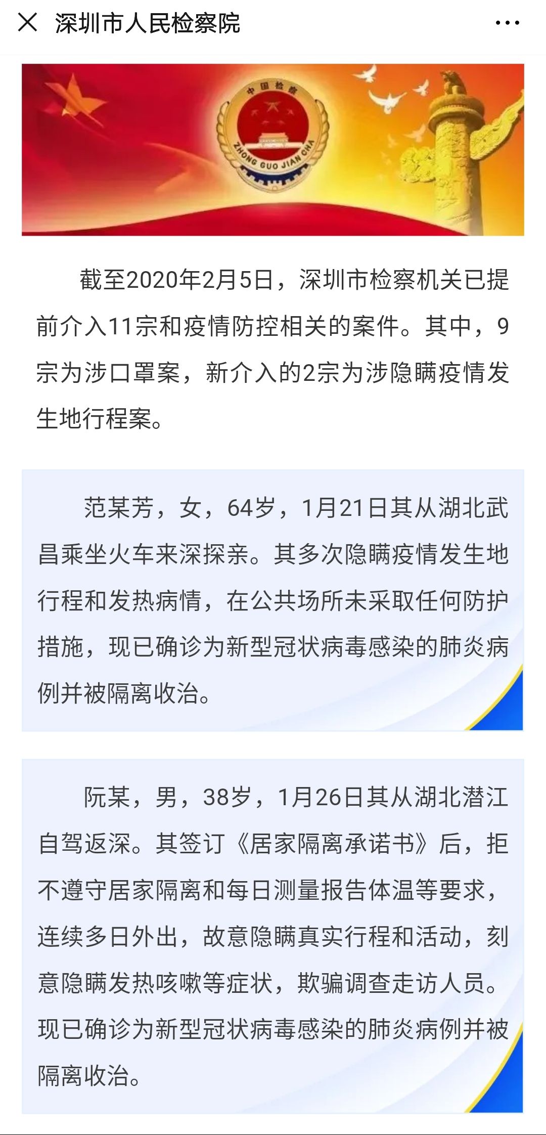 見圳客戶端.深圳新聞網(wǎng)2020年2月5日訊(見圳客戶端、深圳新聞網(wǎng)記者 張玲)截至2020年2月5日,深圳市檢察機(jī)關(guān)已提前介入11宗和疫情防控相關(guān)的案件。其中,9宗為涉口罩案,新介入的2宗為涉隱瞞疫情發(fā)生地行程案。