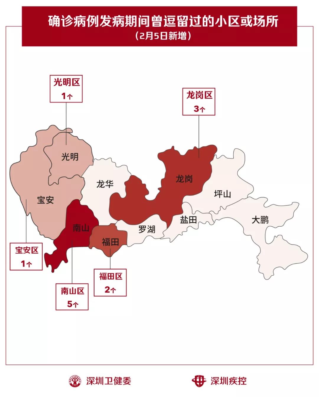 2月5日,疾控專業(yè)人員通過最新的流行病學調(diào)查確認,深圳新增12個小區(qū)(場所),有新確診的病人在出現(xiàn)病征期間曾經(jīng)逗留。