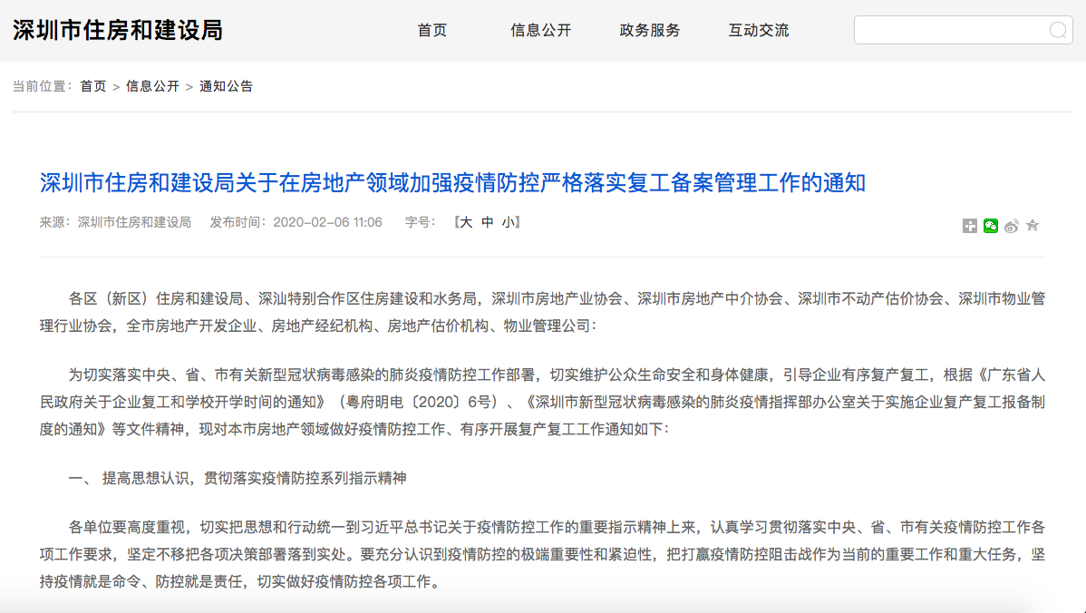 見圳客戶端·深圳新聞網(wǎng)2020年2月6日訊(見圳客戶端、深圳新聞網(wǎng)記者 潘潤華 通訊員 雷湘君)2月6日,深圳市住建局在其官網(wǎng)發(fā)布通知指出,在全省啟動重大突發(fā)公共衛(wèi)生事件一級響應(yīng)期間,暫停房地產(chǎn)項目現(xiàn)場開盤活動,暫停房地產(chǎn)中介線下帶看房活動(企業(yè)自持物業(yè)出租除外),暫停疫情重點地區(qū)現(xiàn)場評估業(yè)務(wù)活動。此外,各物業(yè)管理公司應(yīng)加強人員管理,暫停經(jīng)紀(jì)人員帶客進入小區(qū)看房活動。具體恢復(fù)時間另行通知。