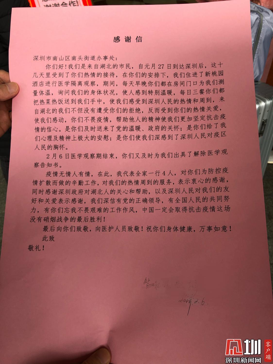 2月6日醫(yī)學(xué)觀察期滿,經(jīng)檢測(cè)他們一家并無不適癥狀,衛(wèi)健局駐點(diǎn)人員為其出具了解除醫(yī)學(xué)觀察告知書。李女士拉著行李滿眼淚花說道:“深圳各級(jí)政府部門高效實(shí)干,深圳的工作人員很熱心很細(xì)心,疫情猖獗時(shí),人間自有真情在,真的感謝你們?!?/span>